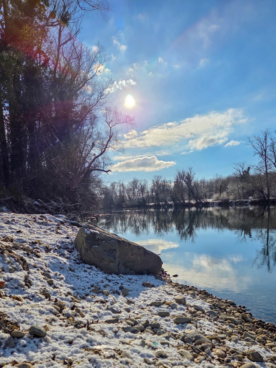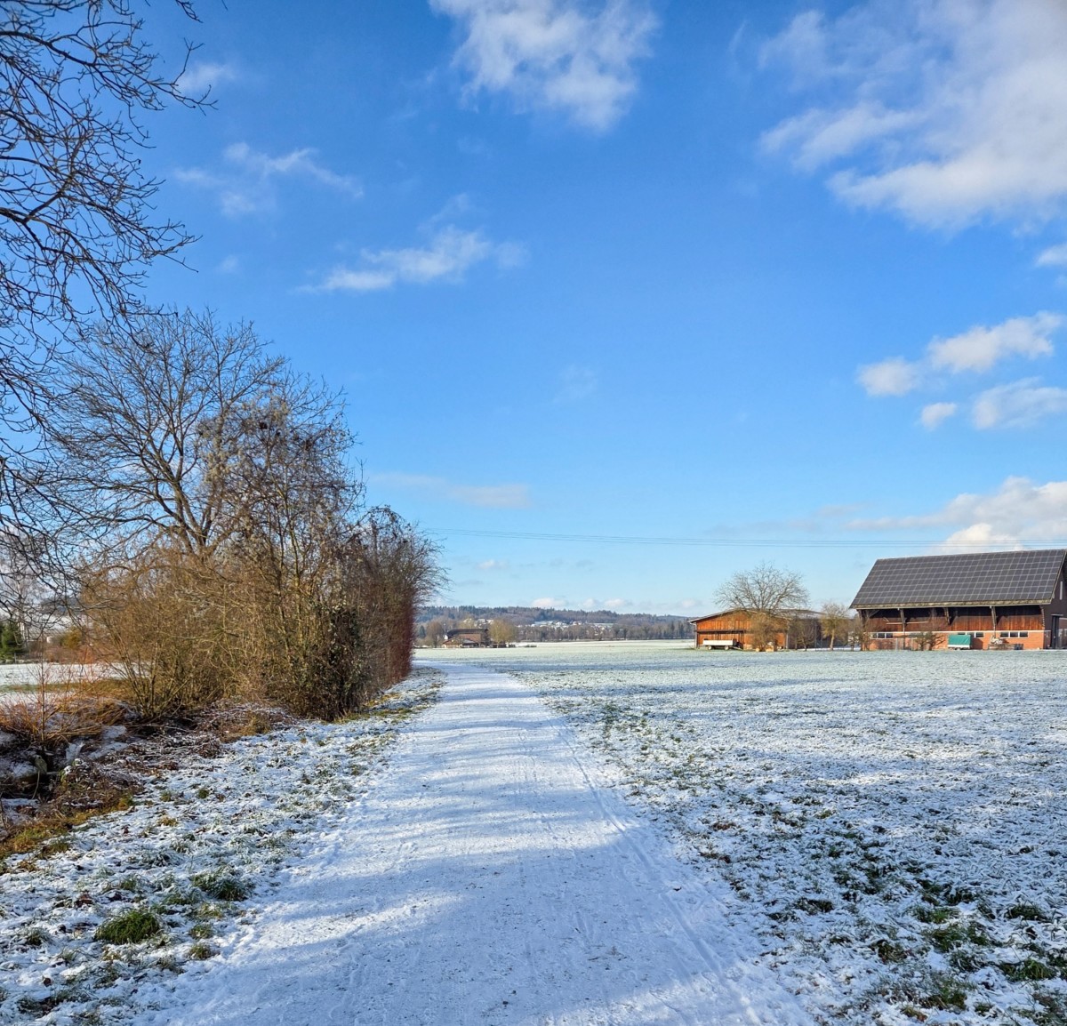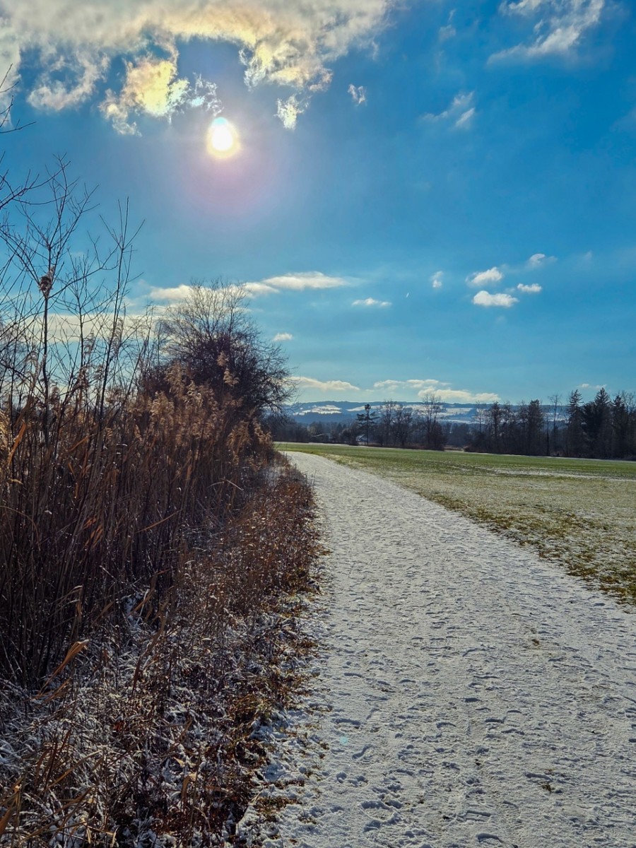 Nach dem Auspacken bin ich losgezogen. Eine Runde in der Reussebene. Still. Leer. Schneebedeckte Wege, die kaum jemand betreten hatte. Es war eiskalt, richtig winterlich, und ich bin zügig gelaufen. Bewegung, die wärmt. Richtung Jonen, dann hinunter zur Reuss. Sie floss ruhig, gelassen, fast meditativ. Der Schnee knirschte unter meinen Füssen, dieser ganz eigene Winterton, den man nicht erklären muss.