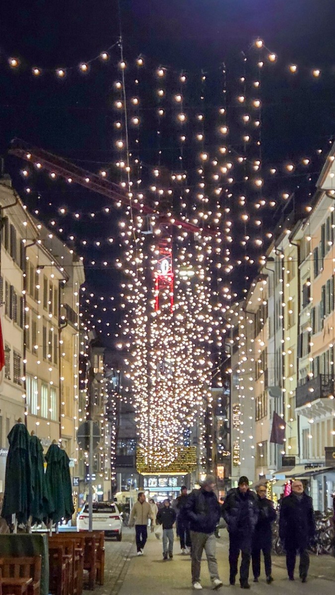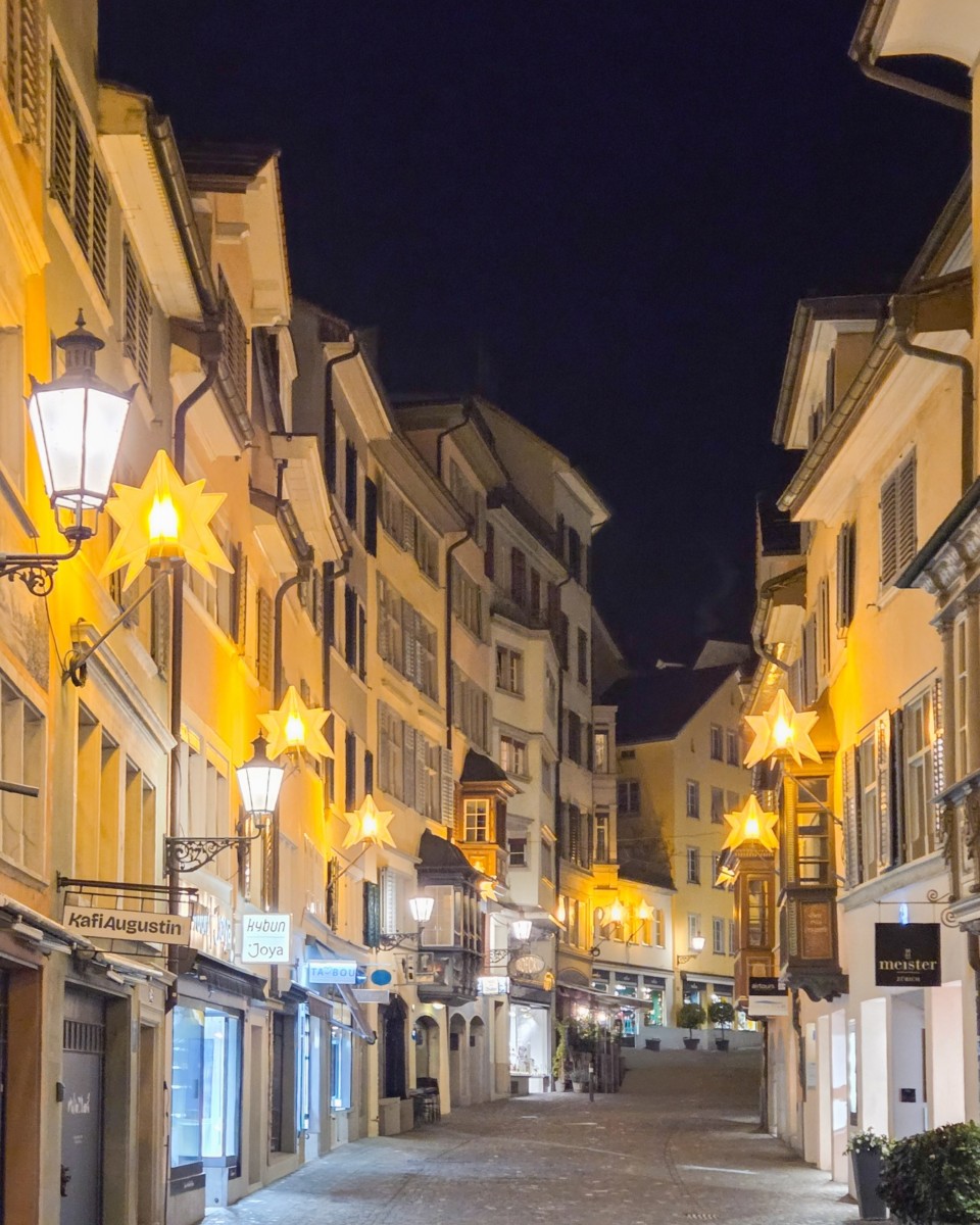 Am liebsten bin ich aber abends in Zürich unterwegs. Dann, wenn die Stadt leuchtet. Wenn sich das Licht in den Fenstern spiegelt und die Gassen warm wirken, auch wenn es kalt ist. Ich gehe meine Lieblingsroute durch die Altstadt: Augustinergasse, Strehlgasse, Schlüsselgasse, Weinplatz, über die Rathausbrücke, weiter Richtung Münsterhof, über die Münsterbrücke, dem Limmatquai entlang, manchmal bis zum Sechseläutenplatz.