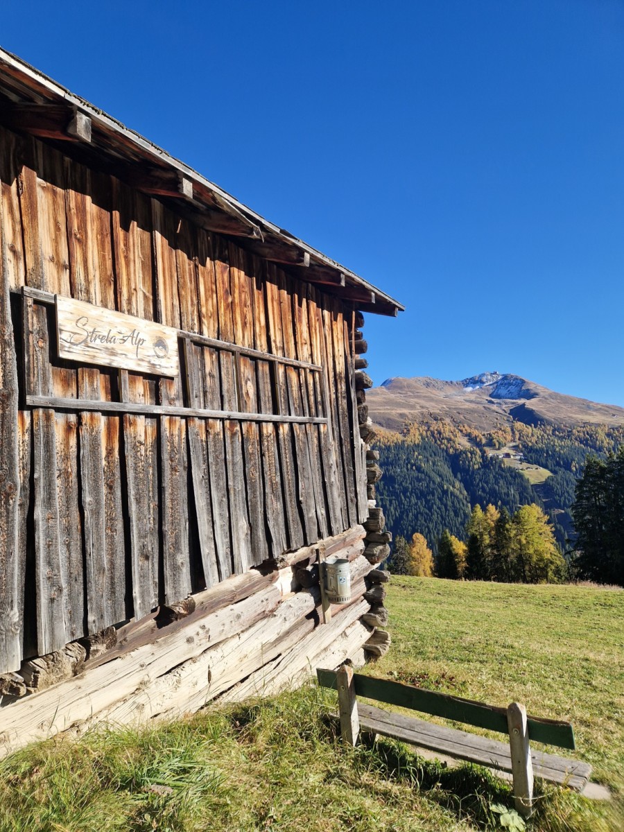 Wir haben dann einen kurzen Spaziergang unternommen und sind zum Berggasthaus Strelaalp spaziert, wo wir in der warmen Sonne sassen und ein Glas Weisswein getrunken und etwas Kleines gegessen haben.